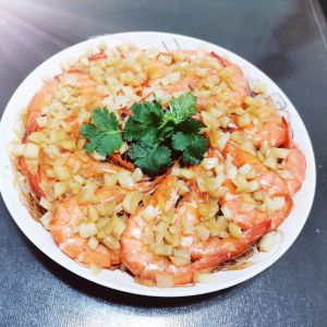 大虾洗干净,剪去虾枪,挑去虾线,整齐摆放在粉丝上面。