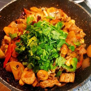 炒香底料后,再放入大蒜瓣,五花肉,虾仁炒一下,再按顺序放入胡萝卜片,洋葱片和青椒片炒香