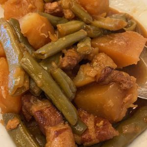 肉表面焦糖色,加入葱姜蒜,翻炒一会加入一大勺豆瓣酱炒香后,加入土豆和豆角翻炒