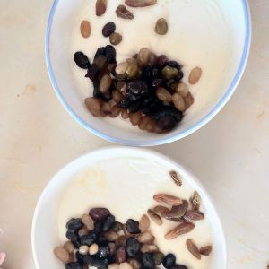 冷凉后,倒入蜜豆,葡萄干(水果都可以哦)冰凉滑溜溜的,很好吃!奶味十足