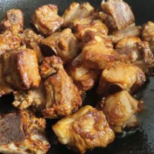 二十分钟后锅中水快干,此时加入我们调制好的汁倒入排骨中,开大火收汁翻炒