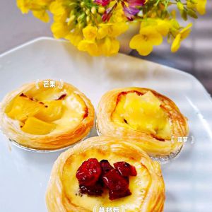 把混合好的蛋挞液倒入蛋挞皮,八分满就可以了!最后加上自己喜欢的水果!