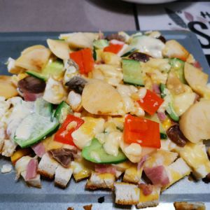 铺上喜欢吃的。也可以加上虾或其他喜欢的水果蔬菜和肉片 那中小火大概三五分钟。 奶酪化了 出锅即可。胡萝卜是脆的。可以放一些自己喜欢的软口感的。 家里没有元葱了,如放一些会增加香气口感。