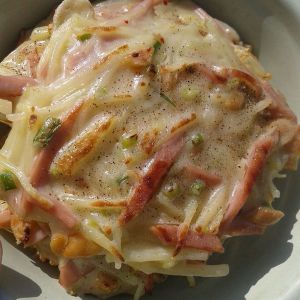 静置十分钟后加热电饼撑。倒点油挖一勺土豆糊稍微用勺子摊一下。三分钟两面金黄就可以出锅了。