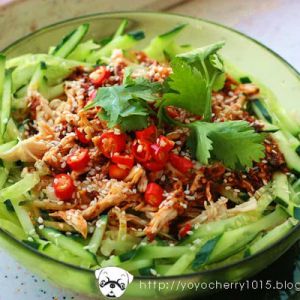 将黄瓜切丝放鸡肉丝上,将调料按个人口味调好淋在肉丝上即可,吃前拌匀。