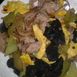 放入切好的黄瓜片、木耳、黄花菜翻炒一会。