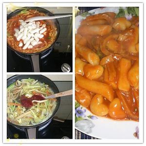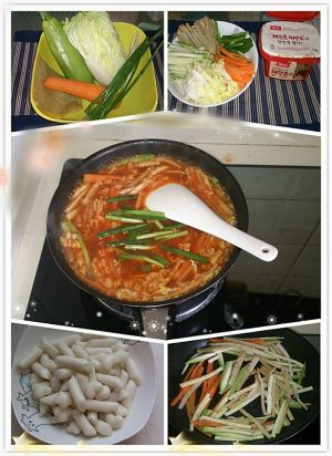 热锅放一小勺油,把切好的胡萝卜,鱼饼,西葫芦,白菜,炒到它们变软了 就可以加入一碗水,然后放2勺辣椒酱,搅拌均匀倒入年糕后改中小火。水量最好多一点能没过年糕就好。