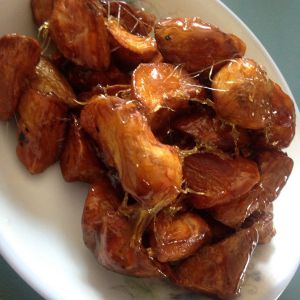 锅内留少量油,倒入白糖用小火化糖,溶好(糖呈红色状)后将炸好的地瓜块放入锅内翻拌,或直接将糖汁倒入盘中的地瓜块上。