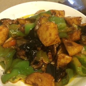 土豆、青椒下锅油炸,土豆要炸熟,表皮发黄、边上略焦就可以了。茄子沾淀粉后入锅炸成金黄色,要炸透,略微塌下一点就好了。