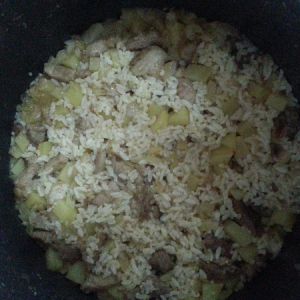 加入淘好的大米;翻匀,将其倒入电饭煲中铺平,加入清水,稍稍高出食材,启动煮饭程序,完成。