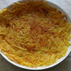热锅凉油,油温热后加入土豆丝,使劲按压,铺得越薄越好