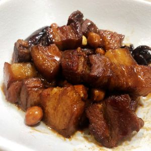放入少许水淀粉(因为糖和油够量,汤汁本身就会比较浓稠,水淀粉不需要太多),大火收汁即可。因为老公喜欢花生,所以我放了点炸花生,不放也可以