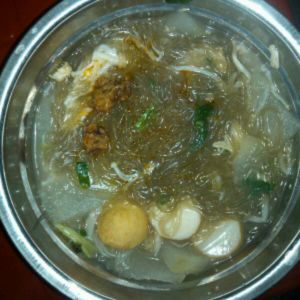 烧红嚄子,把切碎的火蒜爆香,倒进适量的水,把各种材料放进去,等水滚了,最后把红薯粉放进去煮五分钟关火。然后完成!