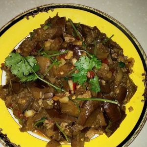 将蒸好的茄子放入油锅里炸香,加一勺盐,一勺剁椒,一勺生抽翻炒一会至油吸干。