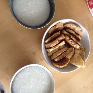 热锅,用少许黄油抹过后下橄榄油。(因为是油炸所以不建议每天食用)然后放入馒头片,记得两面煎。照片为出锅图。同时多余的鸡蛋汁中可以放入少许冷冻青豆,趁煎馒头片的余热摊个薄片鸡蛋饼。
