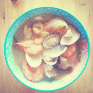 油锅烧热,下姜蒜香叶爆香,放入大虾和花甲,翻炒片刻。