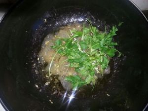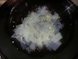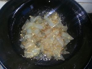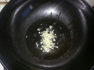 锅内放入油、盐和切碎的蒜头(油不用放太多)。