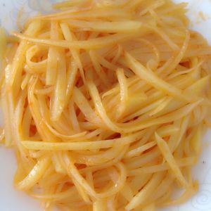 土豆切丝,不会切到超市买个刨丝的,放蝶子用水泡一会,这样土豆丝就不会变绵