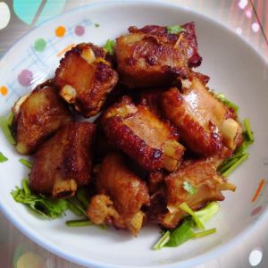 锅内放油少许,放入白糖。变色后放入煮好的排骨,两面都煎黄时,放少许醋。加入煮肉时的汤,收汁后可出锅。