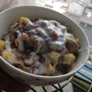 将菠萝切丁,加入剩下的红豆薏仁,加入玉米丁