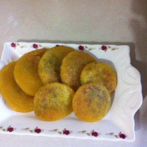 5:可以煎啦'锅内倒入油'油热了'将做好的南瓜团'压扁放入锅里煎'煎至俩面金黄便可'