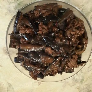 另起锅下底油,煸香葱姜蒜末和豆瓣酱后下肉末迅速炒散。放白糖、少量酱油、醋和清汤(没有清汤可放白水),再下入炸好的茄子。收干汁后用水淀粉勾芡,最后加入鸡精即大功告成。
