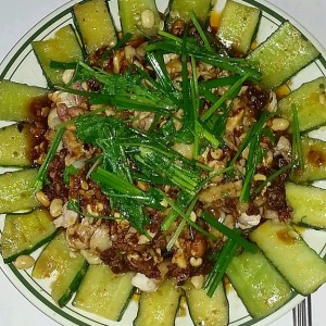 把鸡腿肉从冰水捞出沥干水再用刀切小段切薄、放在碟中间、然后把干花生酒在面上、再把煮好的酱倒上去加上葱芫茜、最后上菜了。