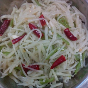 将土豆削皮,洗净,切丝,用水泡10分钟,将干辣椒切段,蒜切碎,备用。