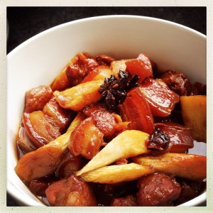 翻炒直至肉开始上色,变金黄色。加入八角桂皮,少量料酒、生抽、老抽继续翻炒。老抽一定要少~