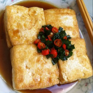先将葱,辣椒稍加爆香后下适量水,盐,生抽煮开,最后盛上做好的豆腐,均匀淋上盘子的豆腐!