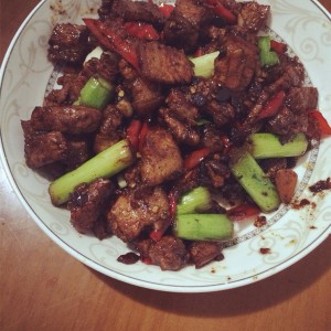 将肉放入大火炒,加一点盐和味极鲜(盐和味极鲜要最好少加,不然会很咸)。如果炒着没水了可以加一点水继续大火炒。