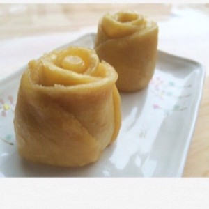 用筷子当面团中间用力夹成两半 就做成两个玫瑰花馒头了