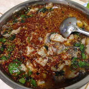 净锅烧热油,这时在鱼肉上放辣椒面,花椒,香菜,油开后,泼在上面,洒上鸡精,即成。
