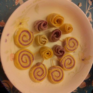玫瑰花的做法是:擀五块面皮,依次叠放在一起,叠的时候,后面一块面皮需盖住前面面皮的三分之二,叠放好后,将五块面皮卷起来,然后用刀从中间切开,两朵玫瑰就制作完成。