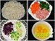 将火腿肠、胡萝卜、青椒、紫甘蓝、大葱全部切成菱形粒,鸡蛋打散,枸杞用凉水泡发;