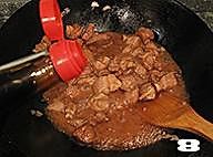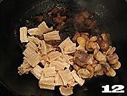 焖制好的羊肉中放入腐竹段和板栗,翻炒均匀。