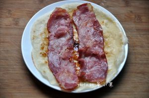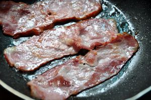 饼皮做好,立马锅中放少许油,培根下锅煎,两面煎,有点焦这样
