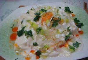 撒上葱花、香菜、盐、鸡精,浇上红油、蒜汁,拌匀即可。