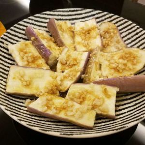 茄子洗干净切大块,均匀撒一些盐,每块都要撒到,蒜切蓉均匀撒在茄子上;