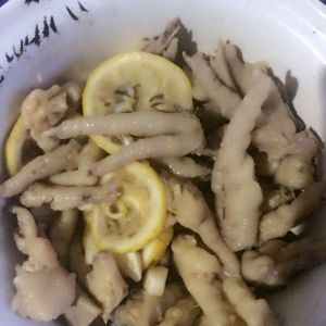 鸡爪放水里煮熟,同时放姜、蒜、黄酒去腥
