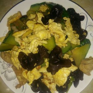 锅中少量油,葱姜末炒香,放入肉炒熟,加入适量味极鲜酱油,翻炒均匀。倒入木耳黄瓜,稍微翻炒一下,放入提前炒好的鸡蛋,放适量盐,翻炒均匀即可。