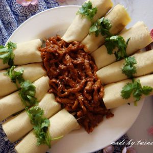 临近食用前,将豆皮从水中取出,沥干水份。取一块儿豆皮,包裹上适量的肉丝、黄瓜丝、葱丝。