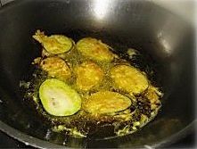 锅里加油烧热,每个茄盒都放到面糊里挂好糊,然后下油锅炸,炸到两面金黄,茄子发软,捞出沥油装盘