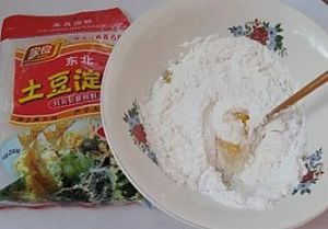 淀粉和面粉二比一的比例,打一个鸡蛋,加水加盐,搅匀。
