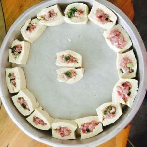 肉剁碎,加生粉盐葱花,豆腐切两半