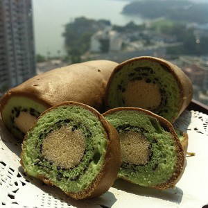 然后重复动作用可可面团把斑兰面团包起来,收口朝下放好,然后上锅蒸