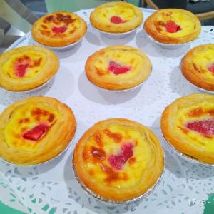 看,烤出来美吧。蛋挞热的时候最好吃啦。还可以烤好以后,再放一些新鲜的草莓。