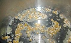 平底锅里放入一块黄油。待黄油完全化开后放入玉米粒,让每粒玉米都裹上黄油。