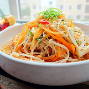 金针菇去掉根部洗净,胡萝卜去皮擦丝备用