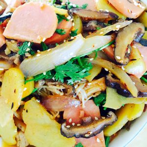 将土豆片,金针菇,香菇丝,方腿肉一起翻炒均匀,倒入郫县豆瓣酱,鲜酱油混合炒匀撒入芝麻